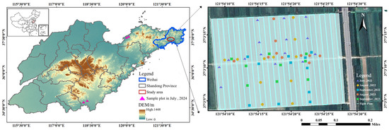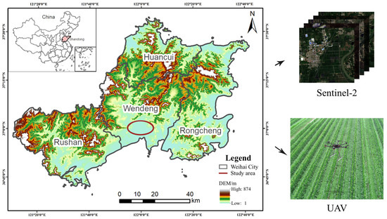The study area is located in the south of the Shandong Province (Figure 1). It is characterized by gently rolling hills and a moderate climate, and it lies at an average altitude of 60 m above sea level. The terrain is free from obstacles in the air, and thus it is an ideal experimental site for UAV data collection.
