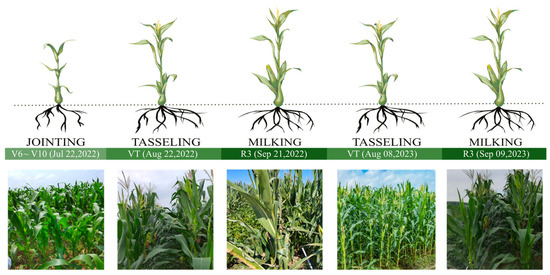 UAV data collection at five dates during the three growth stages of maize. V6~V10 are the sixth-leaf and tenth-leaf stages of maize. VT marks the tasseling stage, and R3 represents the milking stage.