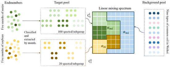 Flowchart illustrating the creation of the hyperspectral database for maize. In the target pool, different green dots are the EMs of maize, and the yellow dots are the EMs of soybeans. In the background pool, different colors represent different soil types. Liniear mixing spectrum comprise data from both target pool and background pool.
