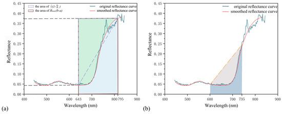 where R is the reflectance, λ is the wavelength, and is the maximum reflectance in near-infrared wavelength regionfrom 643 nm to 795 nm. In this context, equals the reflectance at 795 nm. represents the area of the rectangle within the brown line (Figure 6a). Dividing the integral in blue by the area of the rectangle and subtracting by one will obtain the green area over the reflectance curve (AOC) in Figure 6a.