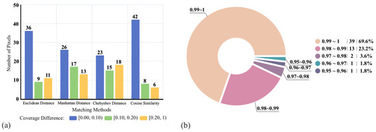(a) Number of pixels corresponding to distinct coverage differences based on four spectral matching methods. (b) Distribution of calculated Cosine similarity values.