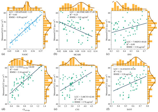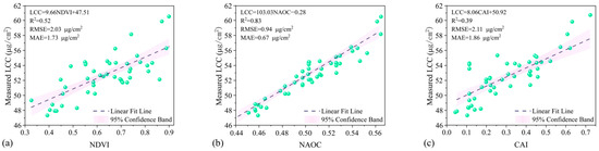 Correlations between the training datasets of measured and retrieved LCCs by the following functional indices: (a) NDVI, (b) CAI, and (c) NAOC.