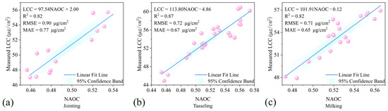 We used 80% of the 56 field measurements of LCC to calculate the linear correlation with the NAOC index, and 20% of data was selected for model validation. To test if the amount of data was sufficient for our method, we randomly choose only 40 field measurements to examine our model’s reliability with the same procedure mentioned above. The results show that with the reduced number of samples, our method still showed a high accuracy of LCC estimation with an R2 value of 0.89, an RMSE of 1.12, and a MAE of 0.90. To further verify the generalization of the method across different areas, four additional points were evaluated in 2024, including intercropping and sole maize scenarios. The result showed the highest degree of correlation with the measured LCCs. With an R2 value of 0.93, this was the best performance based on the correlation coefficient. The RMSE (1.10 μg/cm2) and MAE (1.09 μg/cm2) values were also relatively low, further demonstrating the model’s reliability also at areas with different soil backgrounds.