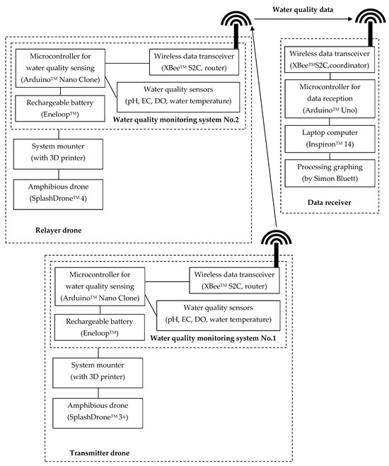 To examine the capabilities for wireless data transfer of the water quality monitoring system with the XBeeTM chips, two amphibious drones were prepared with the water quality monitoring system and the data receiver system (Figure 8 and Figure 9).