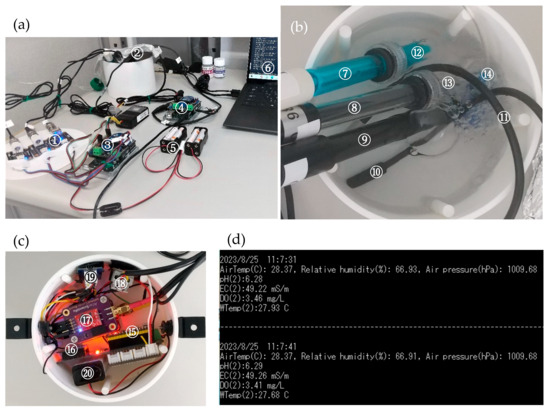 Water quality monitoring modules and output data. (a) Modules for the SplashDroneTM 3+ in a data stability test; (b) sensor electrodes for the SplashDroneTM 3+; (c) modules for the SplashDroneTM 4 in a data stability test; (d) received data displayed on a laptop PC. Its components have been numbered as follows: 1, sensor boards for the SplashDroneTM 3+ system; 2, sensor electrodes for the SplashDroneTM 3+ system; 3, controller for the SplashDroneTM 3+ system; 4, controller for reference temperature measurement with a continuous power source; 5, rechargeable batteries; 6, data display (laptop PC); 7, pH sensor; 8, EC sensor; 9, DO sensor; 10, temperature sensor (reference); 11, temperature sensor; 12, pH 4 buffer solution in a screw cap; 13, EC 1.41 dS m−1 standard solution in a screw cap; 14, aerator; 15, controller for the SplashDrone 4 system; 16, XBeeTM S2C board; 17, sensor boards for pH/EC/DO; 18, sensor board for temperature; 19, I2C connector hub; 20, rechargeable battery (for demonstration of a minimized installation into the system mounter).