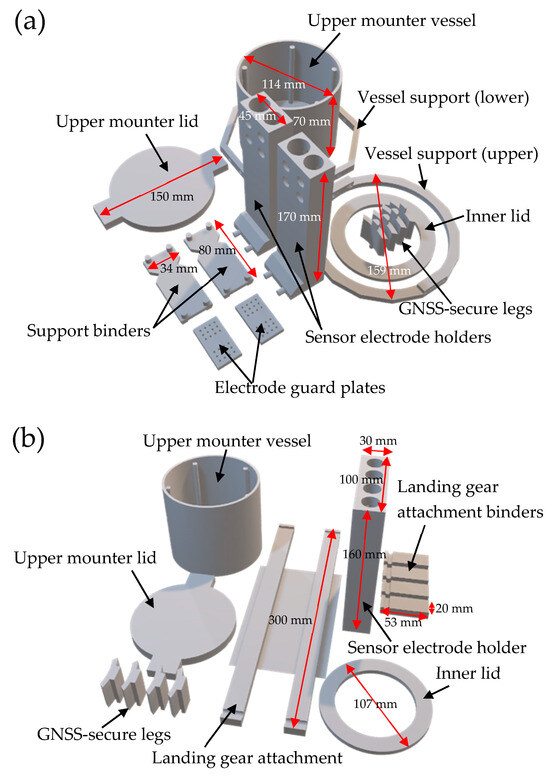 Slicer output images of the mounters for water quality monitoring tools with amphibious drones. (a) Mounters for the SplashDroneTM 3+ with vertical installation of sensor electrodes; (b) mounters for the SplashDroneTM 4 with horizontal installation of sensor electrodes (the holder is shown as a vertical image for 3D-printer output). GNSS-secure legs were used for sufficient space between the bottom of the upper mounter vessel and the GNSS antenna surface of each drone.