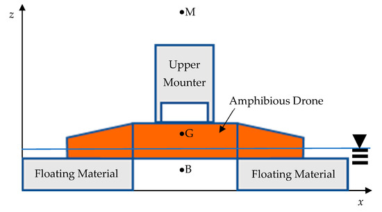 Simplified side-view of the amphibious drone system with an upper mounter and additional floating materials. Some points are identified: M, metacenter; G, center of gravity; B, center of buoyancy. The floating materials are sufficiently narrow to release airflow and minimize the distance from G to B.