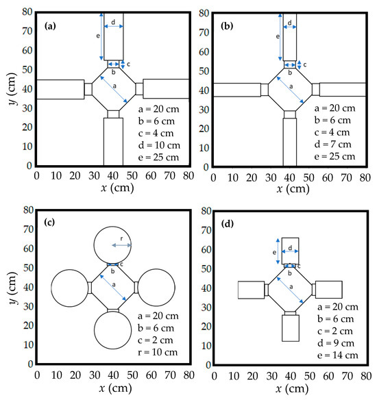 Simplified top view (horizontal view) of the amphibious drone system with additional floating materials: (a) symmetric L-shaped polystyrene-foam bars (the concave of each L-shaped bar is fitted to each of the drone arms, approximately 60 g total weight) made by cutting a polystyrene foam box, (b) empty PET bottles (approximately 940 mL volume, approximately 136 g total weight), (c) coiled tubular polyethylene sponge foam discs (approximately 400 g total weight), and (d) the least amount of sponge-form arm-covers (approximately 85 g total weight) to balance the drones on still water.