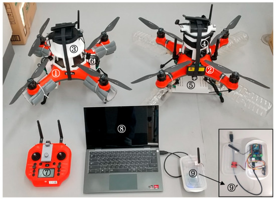 Components of the water quality monitoring system with amphibious drones for wireless data relay tests: 1, SplashDroneTM 3+; 2, SplashDroneTM 4; 3, upper mounter for SplashDroneTM 3+; 4, upper mounter for SplashDroneTM 4; 5, lower mounter for SplashDroneTM 4; 6, side mounter(s) for SplashDroneTM 3+; 7, drone controller for SplashDroneTM 4; 8, laptop computer for data display; 9, receiver; and 9’, contents included in the receiver.