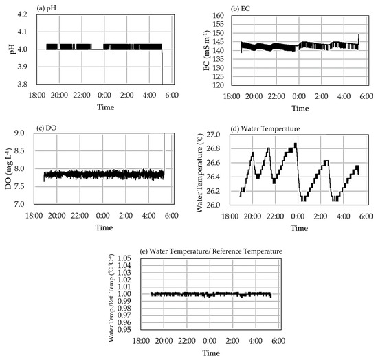 Results of data stability testing of the system for the SplashDroneTM 3+ with rechargeable batteries: (a) pH values of a standard solution (potassium phthalate buffer, pH 4.01); (b) electrical conductivity values of a 1.41 dS m−1 standard solution (141 mS m−1); (c) dissolved oxygen concentration values of the drawn tap water circulated continuously with air bubbling; (d) water temperature values of the tap water; (e) the ratio of water temperature and reference temperature values (the reference temperature values were obtained with stable power source). The EC values were corrected by the water temperature data to represent the values at 298 K. Temperature compensation for the DO measurement was conducted only for the membrane permeability fluctuation (not for standardization).