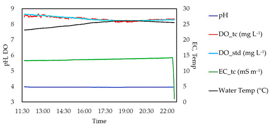 The water quality sensors used for this study showed stable readings until the rechargeable NiMH batteries were depleted (Figure 11). The available sensing time was approximately 10 h at 10 s intervals. Temperature correction was necessary to obtain stable readings with both the EC and the DO sensors. The temperature correction coefficients to minimize the standard deviation of the readings differed for the two DO sensors (4.8% K−1 for Atlas Scientific’s DO sensor and 2.9% K−1 for the DFRobotTM DO sensor). The water temperature values fluctuated, but the ratio of the water temperature to the reference water temperature (measured using a continuous power source) was within the range of 0.99–1.01 (Figure 11). The air pressure values measured using this test increased gradually from 1004 hPa to 1007 hPa. The fluctuation of corrected DO values by the reference water temperature (for membrane permeability correction of the oxygen electrode) (Figure 11) fell within the range of ±5% of deviation of the reference value of oxygen-saturated water with saturated air humidity [29], except for the last three data points before termination by battery depletion. Figure 12 (for the SplashDroneTM 4 system) shows that the DO data fitted well to the standard value predicted by the equation reported by Benson and Krause (1980) [29]. The EC values in Figure 12 declined sharply before battery depletion. The pH values were stable in this room-temperature test (Figure 12).