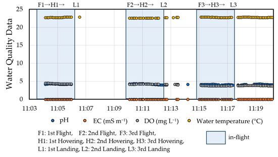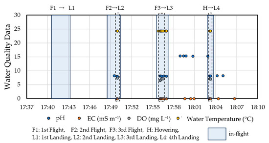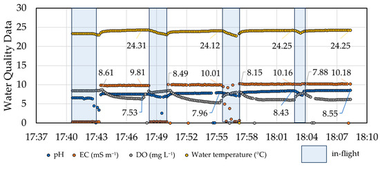 The membrane-electrode DO sensor consumed oxygen to decrease the readings (Figure 13). Therefore, we chose the first reading after each landing on water. Manual measurements of the nearshore water with an optical DO sensor showed oversaturation with oxygen (up to 12.03 mg L−1 at 24.5 °C water temperature, 1004 hPa). In this case, we were unable to wait until a sufficient equilibration time for the DO sensor. The other indicators (pH, EC, temperature) were stabilized after each landing on water (Figure 13). The selected readings showed stable water temperature and electrical conductivity, but the pH value increased during repeated landings on water (Table 2).