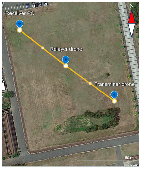 Arrangement of wireless communication devices for quantifying the efficiency of drone hovering in data relaying. The test was conducted on 12 December, 2023 in a flat field at Akita Prefectural University (Akita Campus), Japan. The distance between the transmitter drone and the receiver (connected to a laptop computer) was approximately 100 m. The relayer drone was positioned at the center of the line between the transmitter drone and the receiver. No tall grasses were present in the field on the date of the test. Networking metrics (throughput, RSSI, and PDR) were measured both with and without hovering of the relayer drone. The hovering height was maintained at approximately 3 m.