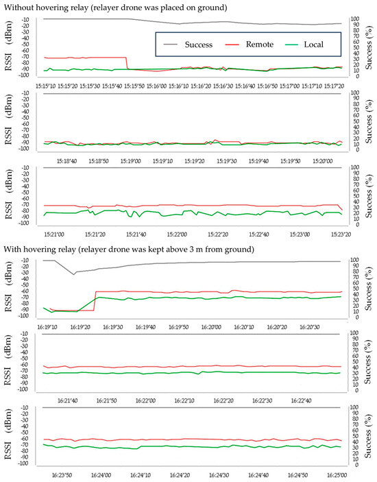 The locations of wireless communication devices are shown in Figure 14. The average throughput in this test was 0.28 ± 0.07 kbps for the on-ground relayer drone and 0.77 ± 0.05 kbps for the hovering relayer drone kept around 3 m from the ground (Figure 15). The range test by the XCTU showed an over +15 dBm increase in the local RSSI by the hovering relay (Figure 16). The average PDR was 97 ± 2.7% for the on-ground relayer and 100 ± 0.3% for the hovering relayer (Figure 16).
