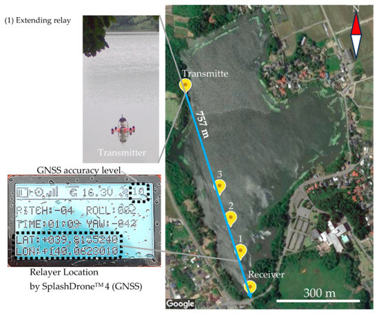 The demonstration experiment was conducted on a large marsh pond with shoreline vegetation (2 m maximum depth, 0.3 km2; Ogata Marsh Pond in Akita Prefectural Koizumigata Park) in Akita, Japan, where most of the water surface is ideally able to be covered using a single amphibious drone (a 500 m radius semicircle). The transmitter drone (SplashDroneTM 3+ system) was placed on the nearshore water with the minimum reinforcing float (Figure 6d); then, the relayer drone (SplashDroneTM 4 system) was brought to the offshore site for data relay to the receiver. The transmitted EC data were zero-filled for the high-concentration range sensor of the SplashDroneTM 3+ system (DFRobotTM EC sensor) because of the low electrical conductivity of the pond water. The receiver was set on a portable tripod (SLIK GX-m 7500; Kenko Tokina Corp., Tokyo, Japan) of 1.8 m height (60% of the Fresnel radius at 2.4 GHz for communication through 300 m of presumed line of sight to a drone). The receiver was located on an elevated (approximately +3.5 m by the Digital Elevation Model 5B (DEM5B), Geospatial Information Authority of Japan) site to increase the allowable distance in wireless communication, but the antenna height of the drone on the water was approximately 0.25 m. The drone and receiver locations were determined using the basic two-ray multipath model applied for earlier studies [19,20,21]. Data relay tests were conducted for (1) extending relay (19 July 2023, cloudy with occasional rain) and (2) bypassing relay for shoreline vegetation (27 September 2022, cloudy with occasional sun). The data relay was attempted for both floating and hovering states (<10 m above the drone controller) of the relayer drone. The use of other wireless communication tools (e.g., smartphone, 5W transceiver) was avoided during the drone flight. A waterproof (IP68) flashlight (Wuben L50; Shenzhen Shengqi Lighting Technology Co., Ltd., Shenzhen, China) was used to confirm the drone direction visually. The interval for water quality measurements was set as 7.0 s for the bypassing relay test, but the interval was extended to 10 s for stable communication in the extending relay test. The exact location of the transmitter in the extending relay test was adjusted by approaching the shoreline vegetation (approximately 2 m adjustment to disable the direct wireless communication).