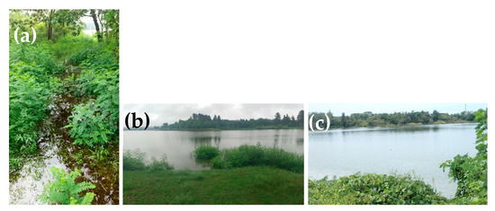 Photographs of the field test site. (a) Path to the pond shoreline with raised water (+0.3 m). (b) Overview from the shore in the extending relay test. (c) Overview from the shore in the bypassing relay test.