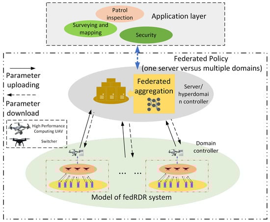 (2) In order to achieve the real-time awareness of the network status, we introduce unmanned aerial vehicles (UAVs) for communication transmission, enabling the entire IoT system to handle tasks more flexibly. We adopt a federated reinforcement learning approach where the server sends the obtained model parameters to each domain, and the intelligent agent in the local domain controller is further trained and updated based on these parameters. This approach allows for the use of independent model parameters within each domain while protecting the privacy of network states within the domain.