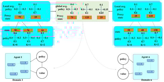 - First, each domain trains the model based on local data and stores tuples . The states in the tuple are then aggregated to form a proxy state set . The policy in the proxy state set is the average of the multiple state policies that make up the proxy state. The average strategy calculation process is as shown in Equation (14):where represents the local model and represents a series of state sets, . All proxy states are combined to form a set.