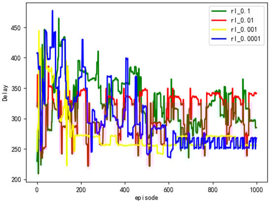 From Figure 3, it can be seen that when the learning rate is set to 0.1 and 0.01, the intelligent agent shows rapid gradient descent in the early stages, but the convergence effect of the algorithm is poor in later stages. Compared with learning rates of 0.0001 and 0.001, the intelligent agent has already converged after 200 iterations with a learning rate of 0.001. Therefore, we set the parameter learning rate to 0.001.