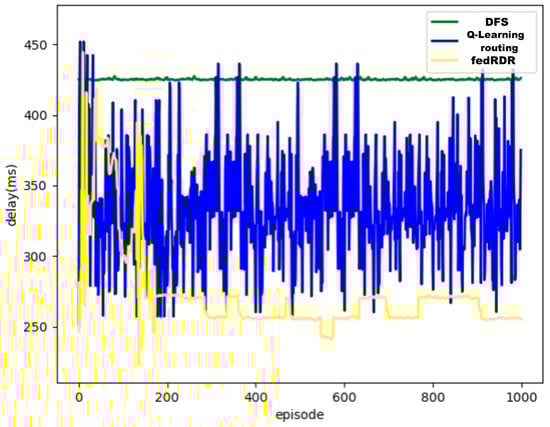 A comparative analysis of the three routing algorithms was conducted under this network state, and the experimental results are shown in Figure 5. From the graph, we can see that the delay in the data transmission using the routing strategy designed by the DFS algorithm is about 130 ms, which is not the optimal forwarding path. However, when the traffic in the network increases, the DFS algorithm cannot implement the optimal forwarding strategy. For state-aware intelligent routing algorithms, the final link delay under the converged state of both is about 25 ms. For the same device, the Q-learning algorithm requires more time to reach convergence compared to the DDQN routing algorithm.