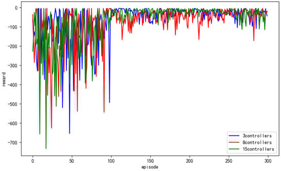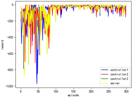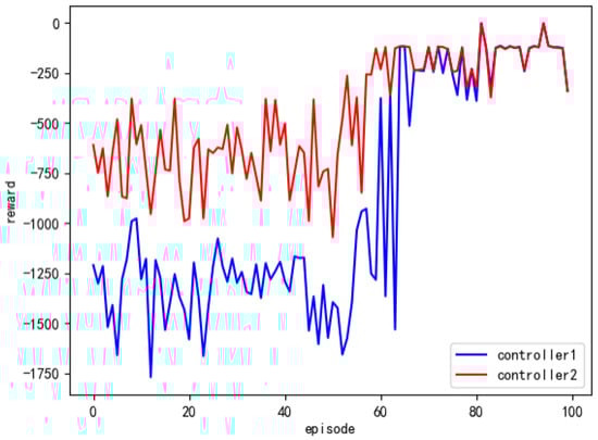 The intelligent agent of domain Controller 1 undergoes local environment training to generate a local experience memory. Once the experience memory storage is full, it is sent to domain Controller 2 to observe its effect on accelerating the training of intelligent agents within the domain. From Figure 12, it can be observed that the model in domain Controller 1 reaches convergence after approximately 70 iterations of training, while the intelligent agent in domain Controller 2 achieves convergence after around 40 iterations of training. This indicates that knowledge transfer can enhance the learning speed of intelligent agents. During the training process in domain Controller 2, the training data are not obtained through the interaction between the local intelligent agent and the environment; instead, they are provided by domain Controller 1. This reduction in the interaction process between the intelligent agent and the environment contributes to the acceleration of training. Therefore, the proposed federated reinforcement distillation-based intelligent routing algorithm can expedite the training process of intelligent agents within domains.