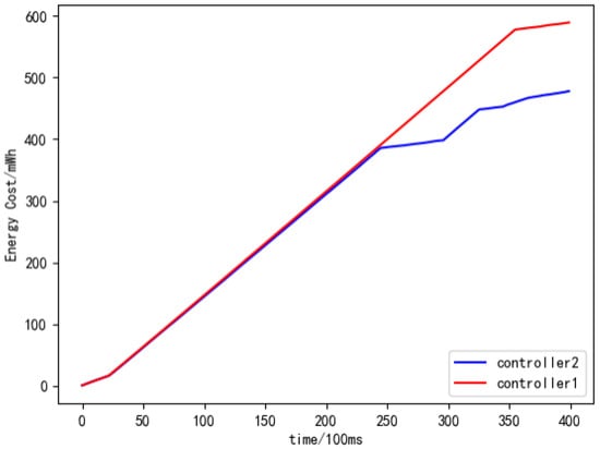 The horizontal axis represents time, with each recording interval being 100 ms. The vertical axis represents energy consumption, measured in milliwatt-hours (mWh). From the graph, it is evident that the energy consumption of the agents in both controllers is nearly identical until the 250th recording. However, since we assigned the model parameters from Controller 1 to Controller 2, the training speed in the second domain controller is accelerated, leading to faster model convergence. Consequently, the training process can be terminated once the model converges. As a result, the second controller concludes training earlier, reducing the energy consumption of the UAV acting as the domain controller due to reduced computation requirements. The federated reinforcement learning-based intelligent routing algorithm necessitates interaction and communication between domain controllers and servers to update the model parameters of intelligent agents. During the communication between the server and domain controllers, we collected data on the amount of exchanged data in model parameter interactions between domain controllers and servers, as illustrated in Figure 11.