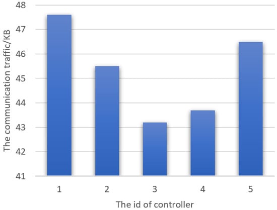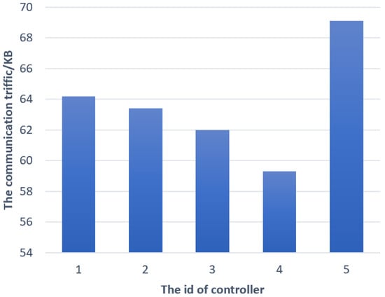 In the federated reinforcement learning routing algorithm, we also examined the size of communications between the server and domain controllers during their interactions, which averaged around 63.6 KB. Additionally, we collected the amount of data transferred between the five domain controllers and the server during each communication, as depicted in Figure 14.