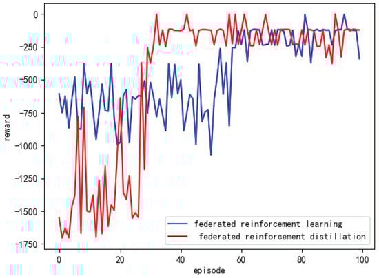 From the graph, it is evident that the federated reinforcement learning model achieves convergence after approximately 60 iterations of training. On the other hand, the federated reinforcement distillation model enters the convergence state after about 40 iterations of training. This indicates that knowledge transfer through federated reinforcement distillation has a better acceleration effect and reduces the training time for single-domain intelligent agents compared to parameter transfer through federated reinforcement learning.