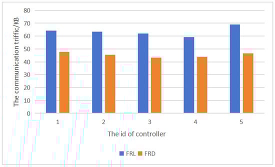 The maximum amount of data transferred between each domain controller and the server during communication was 47.6 KB, whereas in the federated reinforcement learning routing algorithm, the lowest amount of communication data was 59.3 KB. Federated reinforcement distillation demonstrates better communication efficiency compared to federated reinforcement learning. By proxying the state and aggregating the policy of the states, federated reinforcement distillation reduces the communication overheads between the server and domain controllers. In the multi-domain framework utilizing federated reinforcement learning, the average amount of communication between each domain and the server per iteration is approximately 63.6 KB, while in the multi-domain framework based on federated reinforcement distillation, it is around 45.3 KB. Compared to parameter transmission through the federated reinforcement learning algorithm, FedRDR can reduce the amount of transmitted parameters by approximately 29%. The average communication amounts are presented in Table 3.