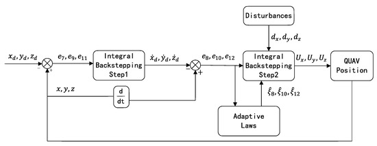 This section is dedicated to the design of a trajectory-tracking control scheme and stability analysis. Taking parametric uncertainties and external disturbances into consideration, a trajectory-tracking control strategy is formulated to ensure the quick and accurate tracking of reference commands. To achieve this goal, a new control scheme is proposed, integrating a terminal sliding mode, an integral element, the backstepping technique, and the dead zone technique for attitude trajectory tracking. For the sake of chattering elimination, a new saturation function is designed. Additionally, an online adaptive estimation technique is introduced to compensate for parametric uncertainties and external disturbances. Adaptive integral backstepping control is introduced in a position loop. Figure 2 illustrates the entire control flow diagram.