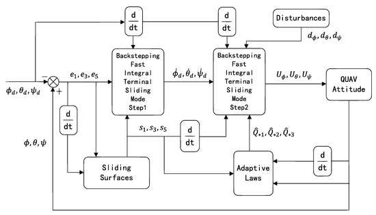 The previously proposed AIBS control has been effective in position tracking, ensuring the stability of the position subsystem. In this section, a robust adaptive backstepping fast nonsingular integral terminal sliding mode control (ABFNITSM) is proposed for attitude tracking. The design process of ABFNITSM is presented in Figure 4. A new saturation function is designed to eliminate chattering. The main objective of this control is to ensure system stability and achieve fast convergence of the Euler angle to the desired trajectory.