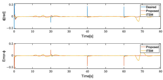 From Figure 13, Figure 14, Figure 15, Figure 16, Figure 17 and Figure 18, it can be observed that the tracking performance of the IBS-ITSM control scheme is not ideal, exhibiting relatively large fluctuations in the presence of disturbances. In contrast, the proposed controller successfully tracked the desired trajectory and attitude faster and more accurately, demonstrating the robustness and superiority of the proposed controller.