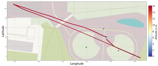 Visualization of a drone’s flight path over the Fraunhofer IVI test oval, with color-coded altitude indicators and microphone positions.