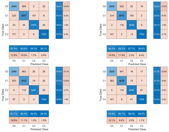 Confusion matrices for four different classifiers (without augmentation), trained under identical conditions.