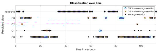Classification results over time for a C3 (‘HP-X4 2020’) drone showing the classifiers predictions, trained with different degrees of noise amplitude.