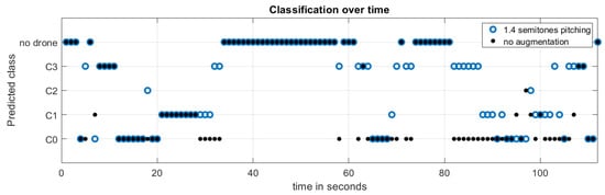 The investigation into pitch augmentation’s effect on classifier accuracy revealed complex outcomes. The analysis, as shown in Table 6, indicates that minor pitch adjustments, up to +/−0.4 semitones, have minimal impact on precision. In contrast, larger alterations lead to reduced accuracies, while the choice of augmentation level, specifically the augmentation by +/−1.4 semitones for the outdoor drone model ‘HP-X4 2020’, might appear contradictory given its performance in Table 6; this decision was grounded in a comprehensive examination of the augmentation effects across all classifiers on real-world examples. It was observed that, despite the seemingly counterintuitive selection based on Table 6’s data, augmenting the pitch by +/−1.4 semitones significantly improved classification accuracy by up to 40%, as depicted in Figure 5. This substantial improvement, illustrated with blue circles, contrasts sharply with the 9.9% accuracy (represented by black dots) observed without augmentation, as previously noted in Section 3.2. Augmentations beyond +/−1.4 semitones further demonstrated substantial accuracy enhancements compared to scenarios without augmentation. This strategic selection, thus, was based on detailed assessments of augmentations’ impacts, identifying +/−1.4 semitones as the most effective for enhancing classifier performance in real-world settings (for this particular example), underscoring the broader applicability and importance of pitch augmentation.