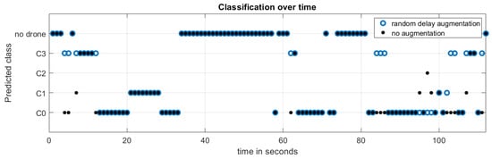 Figure 6 presents the classification performance over time for the ’HP-X4 2020’ drone, comparing non-augmented (black dots) and random delay-augmented (blue dots) scenarios. This augmentation significantly improved accuracy from 9.9% without augmentation to 27.3% with random delay augmentation. Such an enhancement underscores the critical need to simulate a wide array of delay variations, closely resembling the acoustic reflection conditions found in real-world environments. This finding advocates for random delay augmentation as an effective strategy to increase the robustness of classification systems in settings with prevalent echoes and reflections.
