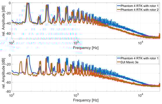 An additional aspect that must be contemplated is the possibility that classification into distinct drone classes based solely on acoustic signatures may not be entirely feasible. Drone noises primarily originate from rotors, with rotor type changes significantly altering the drone’s acoustic footprint. For instance, FFT analyses pre and post rotor change in a Phantom 4 RTK showed similar patterns but noticeable differences with Rotor 2, including harmonics shifting to lower frequencies and a decrease at higher frequencies (see Figure 7). Comparatively, a different C2 drone (DJI Mavic 3e) exhibited a more distinct acoustic fingerprint change, while different drone types can be distinguished irrespective of rotor changes, generalizing acoustic fingerprints by drone classes poses challenges and warrants further investigation.