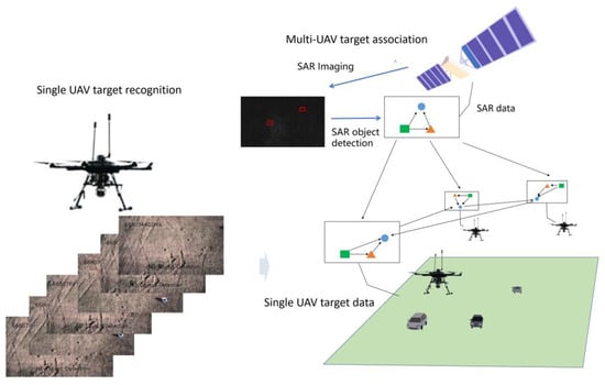 The development of deep learning technology has greatly improved the accuracy of multi-target recognition algorithms employed in a wide variety of fields, including public surveillance. Multi-target matching for multiple unmanned aerial vehicles (UAVs) has important applications in military, production, multimedia and other fields. However, surveillance algorithms in multi-target associations for multiple unmanned aerial vehicles (UAVs) are still subject to a number of deficiencies and still challenging. There still exist technical challenges, especially in the collaborative perception tasks between drone swarms and external sensors such as satellites. This is because it involves the mutual coordination of the two processes of multi-target detection and matching (as shown in Figure 1).