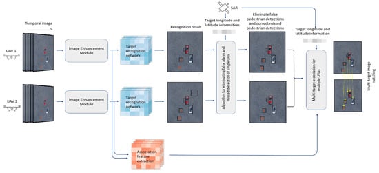 The overall multi-target association scheme proposed in this paper is illustrated in Figure 2 for two UAVs denoted as UAV 1 and UAV 2. In detail, the scheme is mainly composed of five components, including image enhancement modules and target recognition networks for the image data captured by individual UAVs, an association feature extraction network, an algorithm for eliminating false pedestrian detections and correcting missed pedestrian detections for the image data captured by individual UAVs, and an algorithm facilitating the multi-target matching of multiple UAVs.