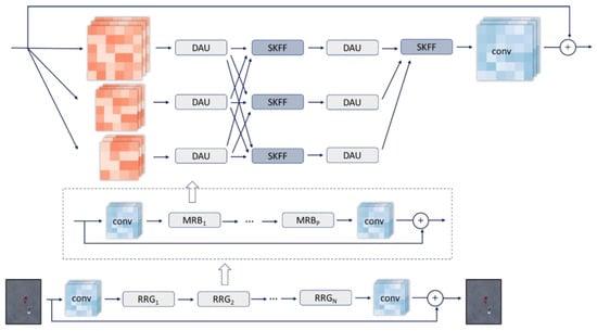 The image enhancement module employed in the present work based on the MIRNet model is illustrated in Figure 3. As can be seen, the main body of the module consists of dual attention units (DAUs) composed of p multi-scale residual blocks (MRBs), where each MRB is mainly composed of a kernel selection feature fusion module, a dual attention unit, and a residual adjustment module. For a given image, the network first extracts its low-level feature, which is then applied to obtain deep features through N recursive residual groups (RRGs), where a cyclic residual group consists of two convolutional layers and P multi-scale residual blocks (MRB). The feature is convolved once to obtain the residual image, and the original image I is combined with R to obtain the final enhanced image. The network structure also allows information exchange across parallel streams via selective kernel feature fusion (SKFF), which helps to consolidate high-resolution features using low-resolution features, and vice versa.