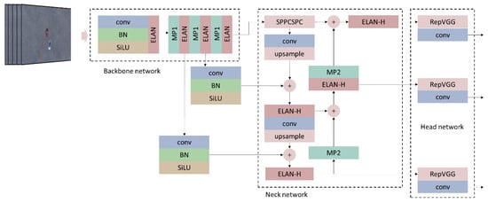 The overall target recognition network architecture is illustrated in Figure 4, and it is composed of a backbone network, neck network, and head network. The backbone network is applied for extracting features from the images. Here, ResNet-50 and Darknet-53 CNN-based architectures are typically employed for feature extraction. The neck network resides between the backbone network and the head network, and it is applied for extracting features with more complex targets or strong semantic information. The head network is mainly used to make predictions regarding the type and location of targets using the features extracted from the backbone and neck networks.