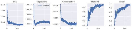 During the training phase, the model’s loss functions include Box Loss, Objectness Loss, and Classification Loss. The curves depicting the changes in training loss and evaluation metrics during the training process are shown in Figure 5. It can be observed that with an increase in the number of training iterations, various losses on the training set exhibit a decreasing trend, gradually converging. The precision and recall on the validation set show upward trends with the number of training iterations, ultimately reaching stability.