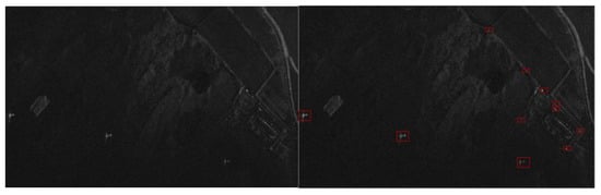 Few public datasets are available specifically for the multi-target association task involving multiple UAVs with vehicle targets. Therefore, we constructed an appropriate dataset for this task and made it public at http://103.30.41.98/ (accessed on 31 January 2024) The dataset displays results of target imaging by UAVs from various flight altitudes and perspectives. The spaceborne Synthetic Aperture Radar (SAR) images along with the corresponding object detection results are shown in Figure 6. The dataset is composed of 400 multi-target images in the training dataset and 200 multi-target images in the testing dataset. Each image in the dataset includes three to five targets. The images were modeled and rendered using the Blender 3D modeling tool to ensure that their characteristics are similar to what would be obtained under actual working conditions. We manually added FP and FN target detections to the training and testing datasets to facilitate a quantitative analysis of the target matching performance. An example of these conditions is illustrated in Figure 7. Here, four cases are considered with different FP and FN target detection rates for UAV 1 and UAV 2, which are presented in Table 1. The false positive detection rate in the table is based on a manually set random detection box, which can be generated via large-scale random generation employing large-range fluctuations in detection box parameters and small-scale random generation employing small-range fluctuations in detection box parameters according to the parameters listed in Table 2, where the settings of the fluctuation ranges are defined in Table 3. Modifications were made in the saved document in the target detection section to obtain the random detection box. The corresponding SAR data are also publicly available at https://github.com/TimeToLive404/sarsata.git (accessed on 31 January 2024).