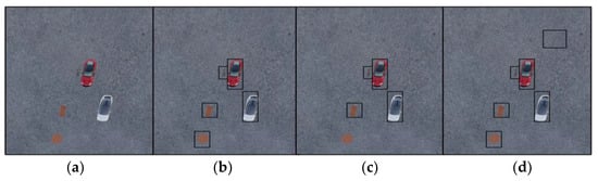Illustrations of associated target data: (a) original multi-objective image data; (b) correct multi-target recognition data; (c) incorrect multi-target recognition data with a single FN detection; (d) incorrect multi-target recognition data with a single FP detection. (The suqre means the target has been detected).