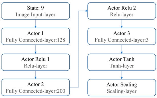 The Actor network consists of three fully connected layers with 128, 200, and 3 nodes, respectively, and receives state input and outputs action signals within a set range. The activation functions of fully connected layers are Relu and Tanh, respectively. The structure of the Actor network is shown in Figure 6.