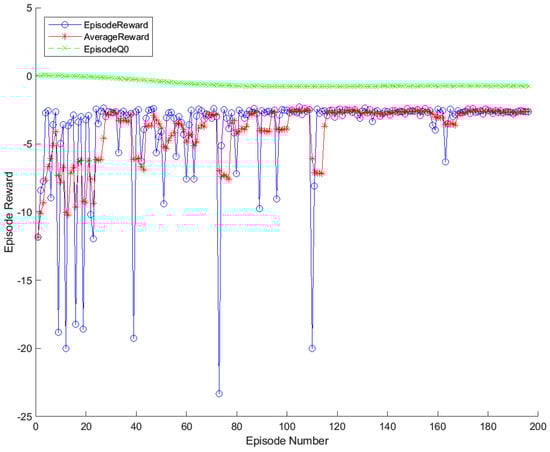 The training process was stopped when the average reward of cumulative training was less than −1 or the number of training episodes reached 200. The final training result is shown in Figure 7, where the green line represents the expected reward value for each training episode, and the blue and red lines denote the actual and average reward values, respectively. It can be seen that the actual reward value suddenly decreases at the 165th training episode, which is a normal result obtained by the agent in the process of continuous exploration, and the difference between the reward value and the maximum reward value is not obvious. With the increase in the number of training episodes, the actual and average rewards converge to the maximum at the 170th training episode, and the actual reward almost coincides with the expected reward. This indicates that the agent has completed training, and can be introduced as a parameter regulator in the above sliding mode controller.