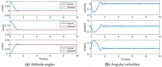 As shown in Figure 8a, the dashed and solid lines represent the desired and actual attitude angles, respectively. The convergence times of attitude angles in three directions (roll, pitch, and yaw) are 1.8 s, 2.1 s, and 1.8 s, respectively, from the initial value to the desired value. This indicates that the quadrotor attitude can be regulated into the desired attitude using the SMC algorithm, in the presence of disturbances.