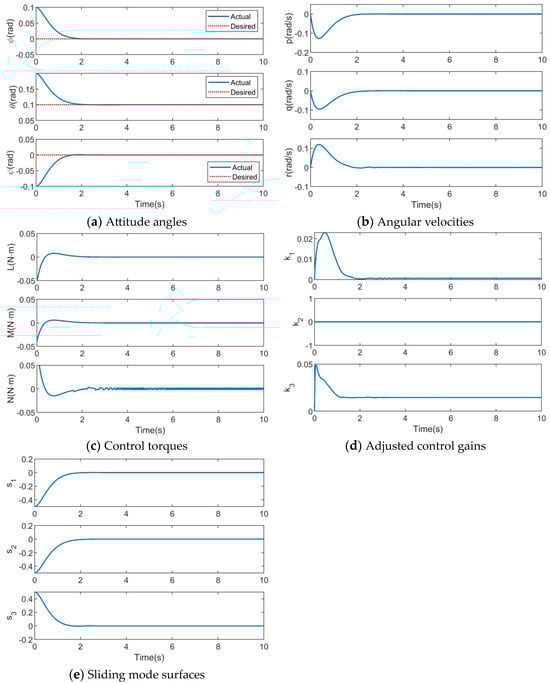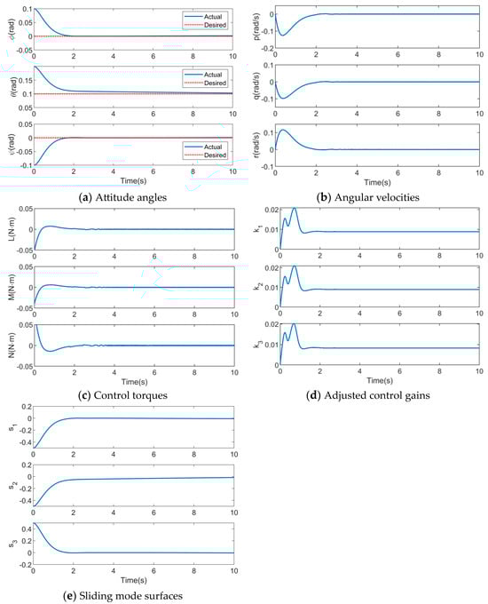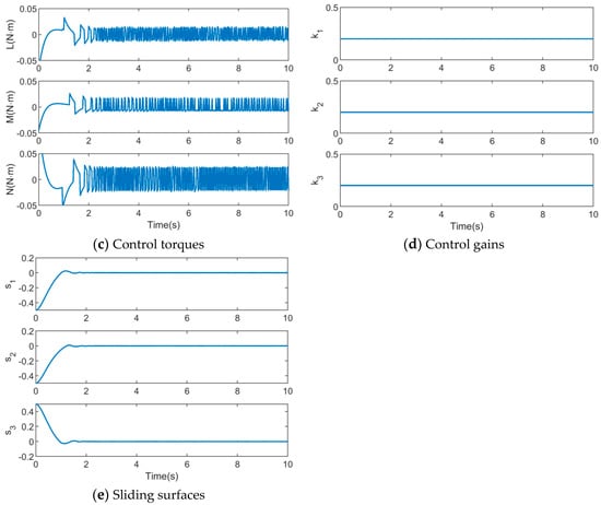 Figure 8d,e represent the time evolutions of control gains related to the reaching law and sliding mode surfaces, respectively. It can be seen that sliding mode surfaces converge to zero asymptotically, and the control gains remain constant throughout the entire simulation process. These constant gains lead to the chattering phenomenon of control signals.
