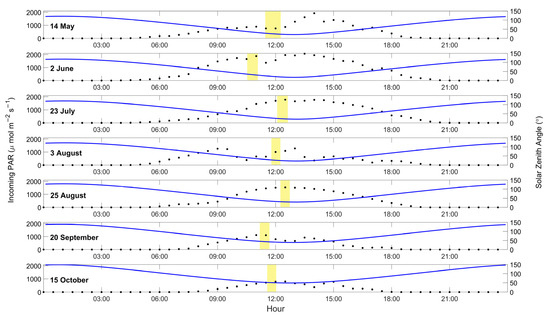 Diurnal overview of the solar conditions on the multispectral survey days. Shown are: the period of UAV image acquisition (yellow shaded areas); half-hourly incoming photosynthetically active radiation (PAR) measured at the site (black dots; SKP215, Skye Instruments Ltd., Llandrindod Wells, UK), and solar zenith angle (blue line) calculated using the NOAA Solar Calculator (https://gml.noaa.gov/grad/solcalc/, accessed on 21 January 2022). From top to bottom are the survey days: 14 May (overcast), 2 June (clear), 23 July (clear), 3 August (overcast), 25 August (clear), 20 September (clear), and 15 October 2021 (clear).